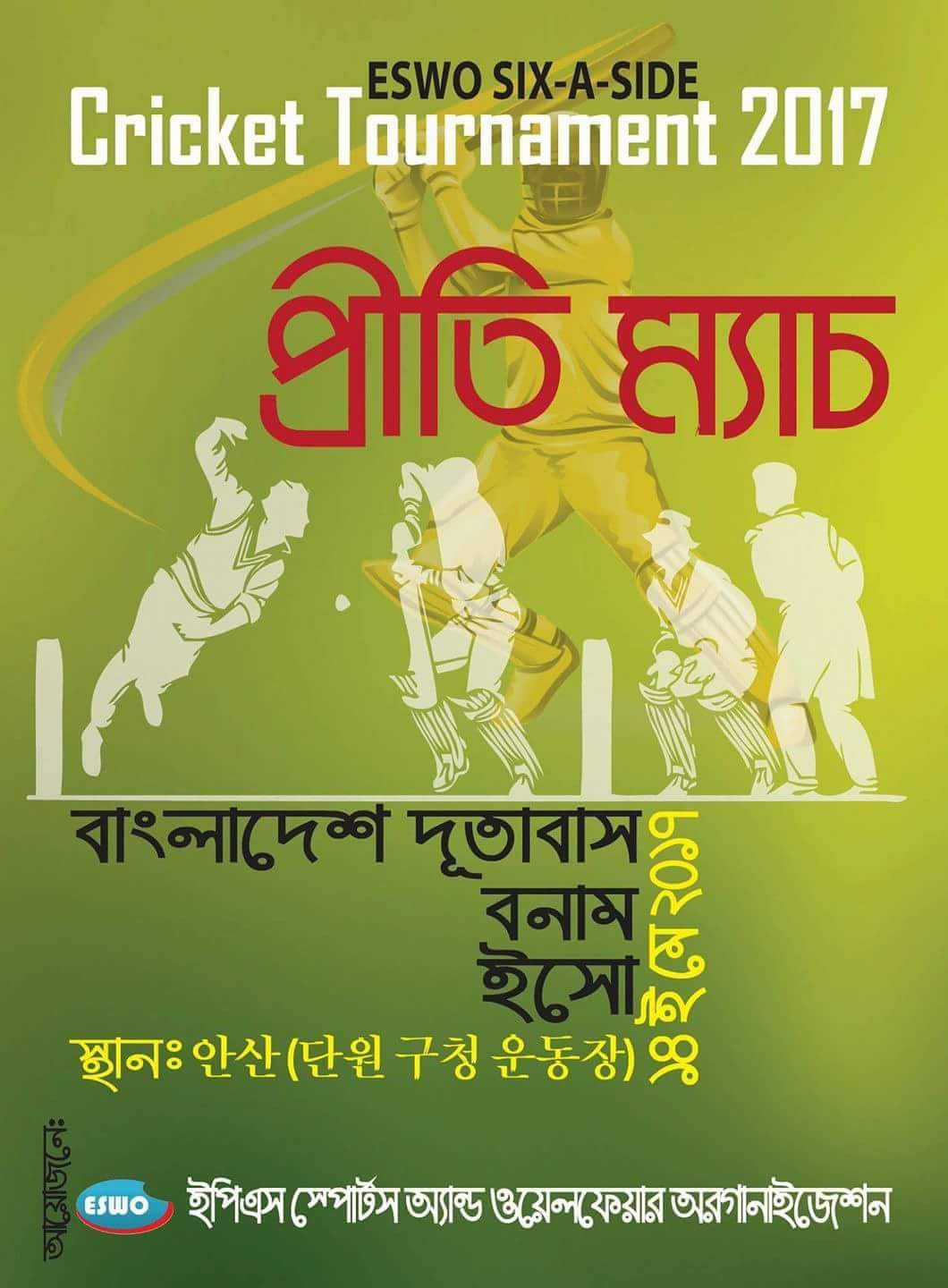 আগামীকাল অনুষ্ঠিত হতে যাচ্ছে দক্ষিণ কোরিয়ায় প্রবাসীদের নিয়ে প্রথমবারের মত আয়োজিত সিক্স এ সাইড ক্রিকেট টুর্ণামেন্টের ফাইনাল। টুর্ণামেন্টে দুর্দান্ত খেলা সিউল সুপারজায়েন্ট বনাম সুপার সিক্সারস ভয়েস ফাইনালে মোকাবেলা করবে। প্রবাসীদের ব্যস্তময় জীবনে আনন্দ দিতে এই টুর্ণামেন্টের আয়োজন করেছে ইপিএস স্পোর্টস এন্ড ওয়েলফেয়ার অর্গনাইজেশন (ইসো)। কোরিয়ার বিভিন্ন অঞ্চল থেকে দশটি দল এই টুর্ণামেন্টে অংশগ্রহণ করে।