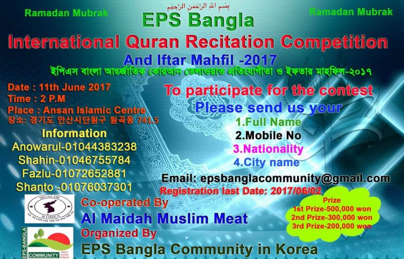 আগামীকাল রবিবার দক্ষিণ কোরিয়ার আনসান মসজিদ ও ইসলামিক সেন্টারে আন্তর্জাতিক কোরআন তেলাওয়াত প্রতিযোগিতা ও ইফতার মাহফিলের আয়োজন করেছে ইপিএস বাংলা কমিউনিটি। দুপুর দুইটা থেকে কোরআন তেলোয়াত প্রতিযোগিতার প্রাথমিক পর্ব শুরু হবে। আল মাইয়িদা মুসলিম মিটের সহযোগিতায় আয়োজিত এই প্রতিযোগিতা এবং ইফতার মাহফিলে প্রধান অতিথি হিসেবে উপস্থিত থাকবেন দক্ষিণ কোরিয়াস্থ রাষ্ট্রদূত জুলফিকার রহমান। এছাড়া অন্যান্য বিভিন্ন দেশের কূটনীতিক, দূতাবাস কর্মকর্তাবৃন্দ, কমিউনিটি নেতৃবৃন্দসহ মুসলিমগণ ইফতার মাহফিলে যোগ দিবেন।