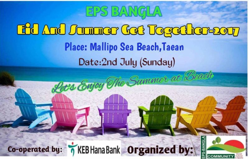 আগামীকাল রবিবার প্রায় সাড়ে চারশ বাংলাদেশী প্রবাসীকে নিয়ে ঈদ ও গ্রীষ্মকালীন মিলনমেলার আয়োজন করেছে ইপিএস বাংলা কমিউনিটি ইন কোরিয়া। ব্যতিক্রমী এই আয়োজন হচ্ছে দক্ষিণ কোরিয়ার অন্যতম আকর্ষণীয় সমুদ্র সৈকত মালিপ্পো বিচে।