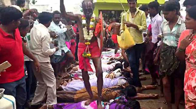 সারি বেধে শুয়ে আছেন নারীরা। তাদের পিঠের ওপর দিয়ে হেঁটে যাচ্ছেন এক ব্যক্তি। শুয়ে থাকা ওই নারীদের বিশ্বাস, এতে তারা অন্তঃসত্ত্বা হতে পারবেন। ঘটনাটি ভারতের দক্ষিণাঞ্চলের অন্ধ্রপদেশের অনন্তপুর জেলার লক্ষ্মী নরসিমা স্বামী মন্দিরের।