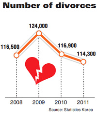 ডেস্ক রিপোর্টঃ ২০০৯ সালের পর থেকে ক্রমান্বয়ে ডিভোর্সের হার কমছে বলে জানিয়েছে কোরিয়ার সরকারী প্রতিষ্টান পরিসংখ্যান কোরিয়া। ২০১১ সালে কোরিয়ায় ডিভোর্সের পরিমান ছিল ১১৪৩০০ যা ২০১০ সালের চেয়ে ২৬০০কম। পরিসংখ্যান কোরিয়ার তথ্য অনুযায়ী, ২০০৩ সালে কোরিয়ায় সর্বোচ্চ পরিমাণ ডিভোর্স হয় যার পরিমাণ ছিল ১৬৬০০০।