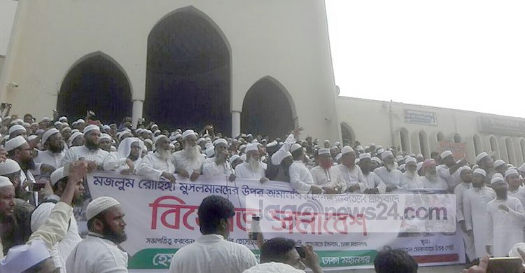 মিয়ানমারে রোহিঙ্গা মুসলিমদের নির্বিচারে হত্যা ও নির্যাতনের প্রতিবাদে জাতীয় মসজিদ বায়তুল মোকাররমের সামনে বিক্ষোভ সমাবেশ ও মিছিল করছেন কয়েকটি ইসলামী দল।
