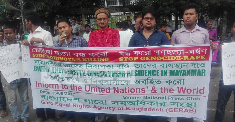 প্রেসক্লাবে এক বিক্ষোভ সমাবেশে বাংলাদেশ গারো সমঅধিকার সংস্থার (গেরাব) নেতারা বলেন, রোহিঙ্গাদের গণহত্যা, ধর্ষণ ও নির্যাতন এখনই বন্ধ করতে হবে। তাদের নিরাপত্তা ও বাসস্থানের ব্যবস্থা করতে হবে।