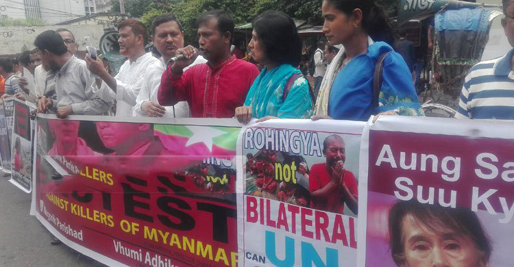 মিয়ানমারে রোহিঙ্গাদের উপর নির্যাতন ও গণহত্যার জন্য দেশটির স্টেট কাউন্সিলর অং সান সু চিকে দায়ী করে আন্তর্জাতিক আদালতে তার বিচার চেয়েছে বাংলাদেশের বিভিন্ন সংগঠন। সু চি’র গণহত্যা বন্ধ করার দাবিতে শুক্রবার সকালে জাতীয় প্রেসক্লাবের সামনে বিক্ষোভ সমাবেশ থেকে একাধিক সংগঠন এ দাবি জানায়।