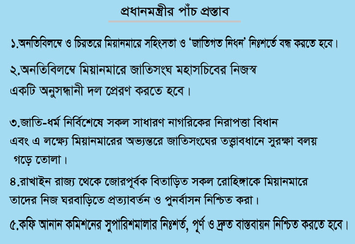 রোহিঙ্গা সংকট নিরসনে বাংলাদেশের প্রধানমন্ত্রী তার পাঁচটি প্রস্তাব তুলে ধরেন। এর মধ্যে রয়েছে, অনতিবিলম্বে ও চিরতরে মিয়ানমারে সহিংসতা ও ‘জাতিগত নিধন’ নিঃশর্তে বন্ধ করা, অনতিবিলম্বে মিয়ানমারে জাতিসংঘ মহাসচিবের নিজস্ব একটি অনুসন্ধানী দল প্রেরণ , জাতি-ধর্ম নির্বিশেষে সকল সাধারণ নাগরিকের নিরাপত্তা বিধান করা এবং এ লক্ষ্যে মিয়ানমারের অভ্যন্তরে জাতিসংঘের তত্ত্বাবধানে সুরক্ষা বলয় গড়ে তোলা। রাখাইন রাজ্য থেকে জোরপূর্বক বিতাড়িত সকল রোহিঙ্গাকে মিয়ানমারে তাদের নিজ ঘরবাড়িতে প্রত্যাবর্তন ও পুনর্বাসন নিশ্চিত এবং কফি আনান কমিশনের সুপারিশমালার নিঃশর্ত, পূর্ণ ও দ্রুত বাস্তবায়ন নিশ্চিত কথাও বলা হয়েছে এই প্রস্তাবে।