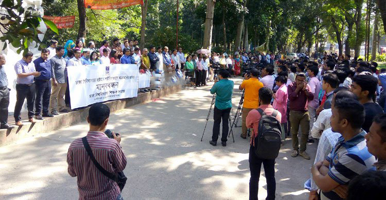 সোমবার দুপুরে বিশ্ববিদ্যালয়ের অপরাজেয় বাংলার পাদদেশে ঢাকা বিশ্ববিদ্যালয় শিক্ষক সমাজের ব্যানারে এ মানববন্ধন অনুষ্ঠিত হয়।