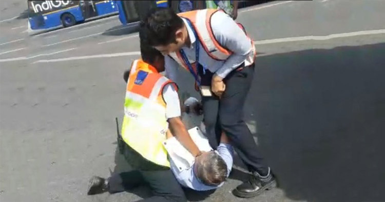 মাটিতে ফেলে এক বৃদ্ধের গলা টিপে ধরেছে এক যুবক। তাকে সাহায্য করছে অন্য একজন। দেখে মনে হতে পারে রাস্তায় কোনো গুণ্ডাগিরি চলছে। কিন্তু এ চাঞ্চল্যকর ঘটনাটি ঘটেছে দিল্লির ইন্দিরা গান্ধী আন্তর্জাতিক বিমানবন্দরে। গতকাল মঙ্গলবার ওই ঘটনার ভিডিও প্রকাশ্যে আসে।
