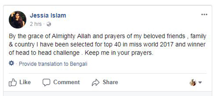 আজ রবিবার জেসিয়া তার ফেসবুকে লিখেছেন, সবাইকে ধন্যবাদ। প্রতিযোগিতার হেড টু হেড চ্যালেঞ্জ পর্বে আমি বিজয়ী হয়েছি। মিস ওয়ার্ল্ড ২০১৭ প্রতিযোগিতায় সেরা ৪০-এ নির্বাচিত হয়েছি আমি। আমার জন্য দোয়া করবেন।’