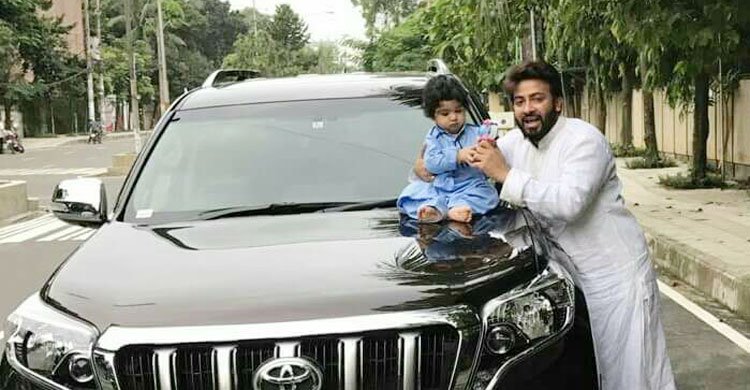 ছবিতে দেখা যায়, সাদা পাজামা আর পাঞ্জাবি পরে দাঁড়িয়ে আছেন ঢালিউড সুপারস্টার শাকিব খান। নিজের কালো রঙের গাড়ির সামনে ছেলে আব্রামকে ধরে রেখেছেন, যেন পড়ে না যায়। বাবার সান্নিধ্যে জয়ও আপন মনে খেলা করছে, হাতে রয়েছে খেলনা।
