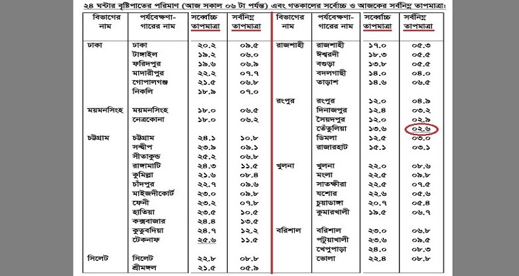 আবহাওয়া অধিদপ্তর জানাচ্ছে, আজ সোমবার সকাল ৬টা পর্যন্ত ২৪ ঘণ্টায় তেঁতুলিয়ার ২ দশমিক ৬ ডিগ্রি সেলসিয়াসই ছিল গত পাঁচ দশকে দেশের সর্বনিম্ন তাপমাত্রা।