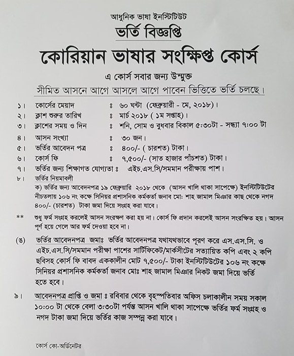 কোরিয়ান ভাষা বিভাগের বিজ্ঞপ্তিতে জানানো হয়েছে ইপিএস ভিসায় কোরিয়া গমণে ইচ্ছুক কিংবা কোরিয়ায় উচ্চশিক্ষা গ্রহণ করতে ইচ্ছুকদের কথা মাথায় রেখে কোর্সটি সাজানো হয়েছে।