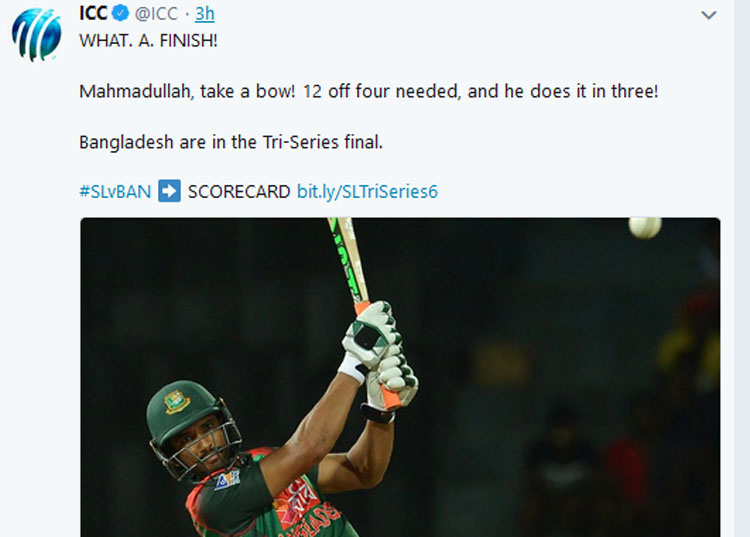 এমন বীরত্বের পর মাহমুদউল্লাহকে প্রশংসায় ভাসিয়েছে বিশ্ব ক্রিকেটের নিয়ন্ত্রক সংস্থা আইসিসি। নিজেদের অফিসিয়াল পেজে মাহমুদউল্লাহকে নিয়ে টুইট করেছে সংস্থাটি। তাতে মাহমুদউল্লাহর ছক্কা হাঁকানোর ছবি সংযুক্ত করে ক্যাপশনে লিখেছে, ‘মাহমুদউল্লাহ, তোমাকে কুর্নিশ করছি। চার বলে ১২ রান প্রয়োজন ছিল। সেখানে তিনি সেটা করে দেখালেন মাত্র তিন বলে। বাংলাদেশ চলে গেল ত্রিদেশীয় সিরিজের ফাইনালে।