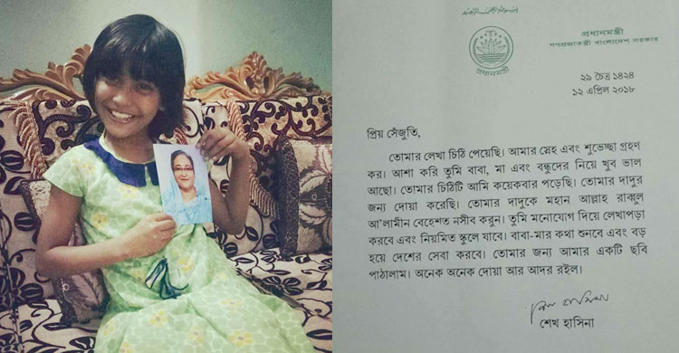 shajutiসেঁজুতির চিঠি পেয়ে প্রধানমন্ত্রী খুব যত্ন করে চিঠির উত্তর দেন। প্রধানমন্ত্রী লেখেন, ‘তোমার লেখা চিঠি পেয়েছি। আমার স্নেহ ও শুভেচ্ছা গ্রহণ কর। আশা করি তুমি বাবা-মা, বন্ধুদের নিয়ে খুব ভালো আছো। তোমার চিঠিটি আমি কয়েকবার পড়েছি। তোমার দাদুর জন্য দোয়া করেছি। তোমার দাদুকে মহান আল্লাহ রাব্বুল আ’লামীন বেহেশত নসিব করুন। তুমি মনোযোগ দিয়ে লেখাপড়া করবে এবং স্কুলে যাবে। বাবা-মার কথা শুনবে এবং বড় হয়ে দেশের সেবা করবে। তোমার জন্য আমার একটা ছবি পাঠালাম। অনেক অনেক দোয়া আর আদর রইলো।’