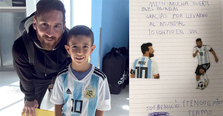 কাগজে স্প্যানিশ ভাষায় লেখা সেই বার্তায় মেসিকে ধন্যবাদ জানায় সে। ‘মেসি তোমার জন্য শুভকামনা এবং ধন্যবাদ আর্জেন্টিনাকে বিশ্বকাপে তোলার জন্য। আমি তোমাকে বিশ্বাস করি। আমার নাম বেনিকো।’ বিশ্বকাপে আর্জেন্টিনা তাদের প্রথম ম্যাচ শুরু করবে ১৬ই জুন আইসল্যান্ডের বিপক্ষে লড়াই দিয়ে।