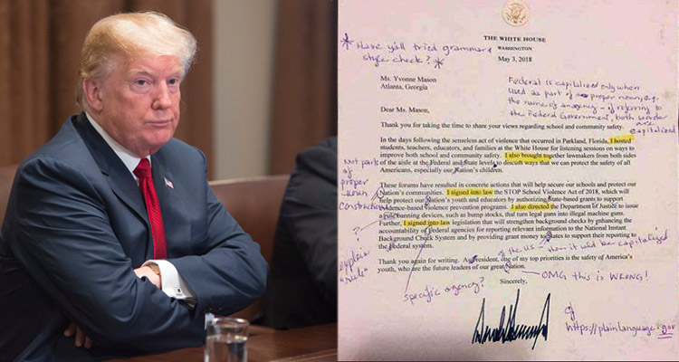 ডোনাল্ড ট্রাম্পের লেখা ভুলে ভরা একটি চিঠি শুধরে দিয়ে হোয়াইট হাউজে ফেরত পাঠিয়েছেন যুক্তরাষ্ট্রের আটলান্টার এক অবসরপ্রাপ্ত স্কুলশিক্ষক। গত ৩ মে ইভোন্নি ম্যাসন নামে ওই শিক্ষিকার কাছে চিঠিটি পাঠানো হয়েছিল।