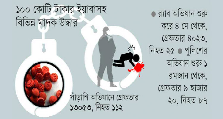 এদিকে মাদক নির্মূলে সারাদেশে র্যাব-পুলিশের সাঁড়াশি অভিযানে এ পর্যন্ত গ্রেফতার হয়েছে ১৩ হাজার ৫৩ শীর্ষ মাদক ব্যবসায়ী ও মাদক সেবনকারী। নিহত হয়েছে ১১২ জন। উদ্ধার করা হয়েছে ১০০ কোটি টাকার ইয়াবাসহ বিভিন্ন মাদক। র্যাবের অভিযান শুরু হয় গত ৪ মে থেকে। র্যাবের অভিযানে এ পর্যন্ত গ্রেফতার হয়েছে ৪ হাজার ২৩ জন। গ্রেফতারকৃতদের মধ্যে ৩ হাজার ২৭৬ জনকে বিভিন্ন মেয়াদে সাজা দেওয়া হয়েছে। মোট অভিযান পরিচালনা করা হয় ৭২৪টি। র্যাব ৫৯ কোটি টাকার মাদক উদ্ধার করে। র্যাবের সঙ্গে গুলি বিনিময়কালে ২৫ শীর্ষ মাদক ব্যবসায়ী নিহত হয়েছে।