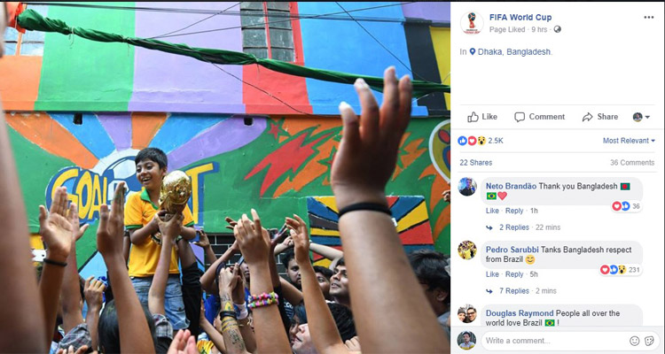 বাংলাদেশের স্থানীয় সময় ভোর ৫টার সময় বাংলাদেশের পুরান ঢাকার গোল ফেস্টের তিনটি ছবি এবং ঢাকা বিশ্ববিদ্যালয়ের টিএসসিতে বড় পর্দায় খেলা দেখার একটি ছবি পোস্ট করে ‘ফিফা ওয়ার্ল্ড কাপ’ নামক পেজটি, যেটি ফিফার অফিশিয়াল ফেসবুক পেজ হিসেবে পরিচিত। ইতোমধ্যে কমেন্ট বক্সে বাংলাদেশিদের শুভেচ্ছা বার্তায় সয়লাব পুরো পোস্টটি।