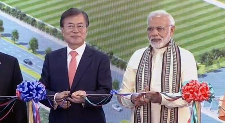 বিশ্বের সবচেয়ে বড় মোবাইল ফোন কারখানা উদ্বোধন করছেন দক্ষিণ কোরিয়ার প্রেসিডেন্ট মুন জে-ইন ও ভারতের প্রধানমন্ত্রী নরেন্দ্র মোদী