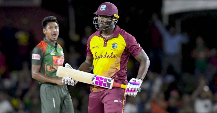 রান তাড়া করতে নেমে ইনিংসের দ্বিতীয় ওভারেই উইন্ডিজ ওপেনার এভিন লুইসকে সাজঘরে ফেরত পাঠান মোস্তাফিজুর রহমান। রিভিউ নিয়েও নিজের উইকেট বাঁচাতে পারেননি উইন্ডিজ ওপেনার। ফিরে যান রানের খাতা খোলার আগেই।