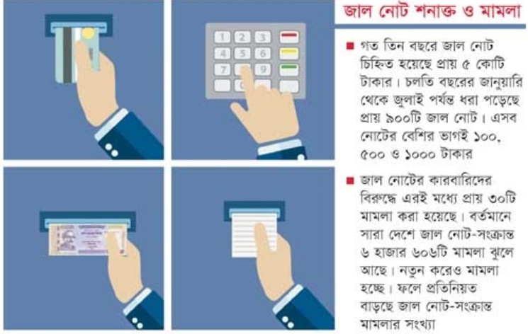 দেশে জাল টাকা তৈরি ও বিপণনকারীদের বিরুদ্ধে নিয়মিতই অভিযান চালায় আইন-শৃঙ্খলা রক্ষাকারী বাহিনী। বিভিন্ন সময়ে বিপুল অর্থের জাল নোট জব্দও করা হয়। গত তিন বছরে প্রায় ৫ কোটি টাকার জাল নোট চিহ্নিত করা হয়েছে। চলতি বছরের জানুয়ারি থেকে জুলাই পর্যন্ত প্রায় ৯০০টি জাল নোট ধরা পড়ে। জাল করা এসব নোটের বেশির ভাগই ১০০, ৫০০ ও ১০০০ টাকার। এর সঙ্গে যুক্ত অর্থের পরিমাণ প্রায় ৭ লাখ টাকা। এরই মধ্যে এসব জাল নোটের কারবারিদের বিরুদ্ধে প্রায় ৩০টি মামলা হয়েছে। বর্তমানে সারা দেশে জাল নোট-সংক্রান্ত ৬ হাজার ৬০৬টি মামলা ঝুলে আছে। এর মধ্যে নতুন মামলা হচ্ছে। ফলে প্রতিদিনই জাল নোট-সংক্রান্ত মামলার সংখ্যা বাড়ছে।