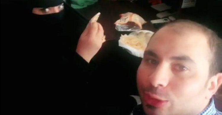 টুইটারে শেয়ার করা ভিডিওতে দেখা গেছে, মিসরীয় টানে আরবী বলছে এমন এক পুরুষ নাস্তা করছে। তার পাশে বসে আছে বোরকা পরা এক নারী। নেকাবে মুখ ঢাকা ওই নারীকে সৌদি বলেই ধরে নেয়া হচ্ছে।