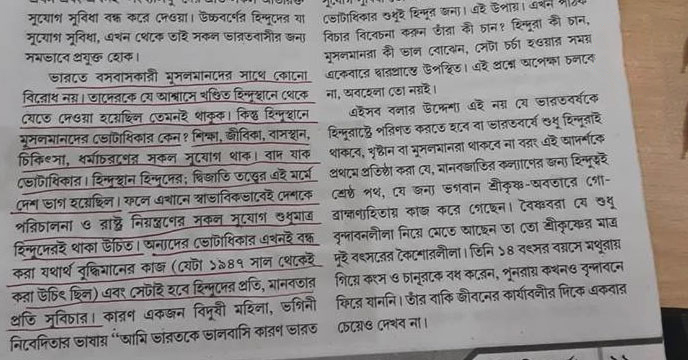 ‘হিন্দু সমাজ ভাবনা’ শীর্ষক প্রবন্ধটিতে লেখক লিখেছেন, ‘‘হিন্দুস্থান হিন্দুদের তাই অন্যদের ভোটাধিকার এখনই বন্ধ করা উচিৎ৷ ১৯৪৭ সাল থেকেই এটি করা উচিৎ করা ছিল৷রাষ্ট্র পরিচালনা ও নিয়ন্ত্রণের সকল সুযোগ শুধুমাত্র হিন্দুদেরই থাকা উচিৎ৷ মুসলমানদের প্রতি কোনরকম বিরোধ নেই৷ তারা আমাদেরই পূর্বপুরুষের জ্ঞাতি ও আত্মীয়৷ তারা একমাত্র হিন্দুত্বে ফিরে আসলেই পাক ভোটাধিকার৷’’
