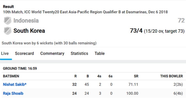 প্রথমে ব্যাট করতে নেমে ইন্দোনেশিয়া ১৭.৫ ওভারে মাত্র ৭২ রান করে অলআউট হয়ে যায়। কোরিয়ার পক্ষে বোলিং এ তিন ওভারে মাত্র ৮ রান দিয়ে ২ উইকেট তুলে নেন সজল (কিম দে ইয়ন)। ৭৩ রানের লক্ষ্যে ব্যাট করতে নেমে দক্ষিণ কোরিয়া ৪ উইকেট হারিয়ে জয় পায়। একপাশে দ্রুত উইকেট পড়লে আরেকপাশে উইকেট আগলে দলকে জয় তুলে দেন নিশাত। ওপেনার হিসেবে নেমে নিশাত নাজমুস সাকিব অপরাজিত ৩২ রান করেন।