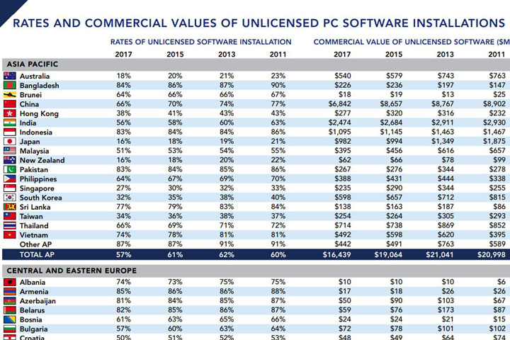 প্রতিবেদনে দেখা যায়, ২০১৭ সালে ৮৪ শতাংশ নকল সফটওয়্যার ব্যবহার করে পাইরেটেড সফটওয়্যার ব্যবহারকারী দেশগুলোর তালিকায় পঞ্চম স্থানে আছে বাংলাদেশ। এক্ষেত্রে এশিয়া প্যাসিফিক অঞ্চলে বাংলাদেশের অবস্থান শীর্ষে।