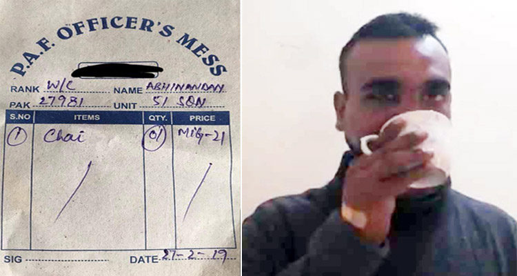 এদিকে সামাজিক যোগাযোগমাধ্যমে পাকিস্তান বিমান বাহিনীর অফিসার্স মেসের একটি ক্যাশ মেমোর ছবি ভাইরাল হয়েছে, যেখানে পাইলট অভিনন্দনকে খাওয়ানো চায়ের মূল্য হিসেবে মিগ-২১ যুদ্ধবিমানটি নেওয়ার কথা বলা হয়েছে। পাকিস্তান বিমান বাহিনীর অফিসার্স মেসের ক্যাশ মেমোটিতে আইটেমের ঘরে লেখা হয়েছে ‘চা’। আর প্রাইজের ঘরে লেখা হয়েছে ‘মিগ-২১’। তারিখ ২৭ ফেব্রুয়ারি ২০১৯।