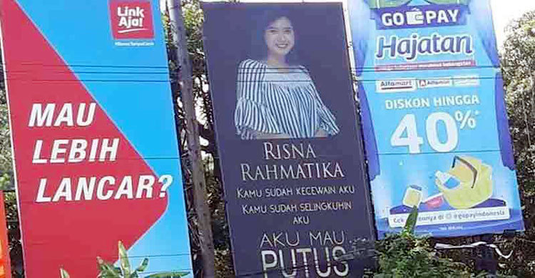 বলতে গেলে আধুনিক যুগে ব্যবসায়-বাণিজ্যের প্রধান মাধ্যম হলো বিজ্ঞাপন। কারণ পণ্যের প্রসার ও প্রসারের এটাই সবচেয়ে জনপ্রিয় ও কার্যকর মাধ্যম। বিজ্ঞাপন দেখেই অনুপ্রাণিত হন ভোক্তা ও ক্রেতারা। তাই বলে প্রেমে ব্রেক-আপ করতে কখনো কি বিজ্ঞাপন দিতে দেখেছেন? শুনতে অবাক লাগলেও ইন্দোনেশিয়ার এক যুবক প্রেমে প্রতারিত হয়ে ব্রেক-আপ করতে বিজ্ঞাপন দিয়েছেন।