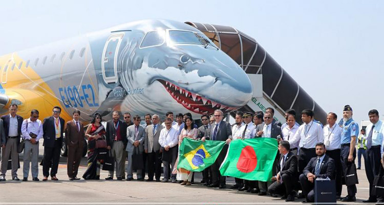 বিশ্বজুড়ে পরিভ্রমণের অংশ হিসেবে বাংলাদেশে প্রদর্শিত হলো ব্রাজিলিয়ান আকাশযান প্রস্তুতকারক প্রতিষ্ঠান এমব্রায়ারের তৈরি ই১৯০-ই২ উড়োজাহাজ। এর সামনের অংশে হাঙরের মুখ আঁকা। বৃহস্পতিবার (২১ মার্চ) হজরত শাহজালাল আন্তর্জাতিক বিমানবন্দরে এটি ঘুরে দেখেছেন দেশের এভিয়েশন খাতের সংশ্লিষ্টরা। প্রায় একঘণ্টা তাদের নিয়ে বাংলাদেশের আকাশে ওড়ে ‘হাঙর বিমান’।