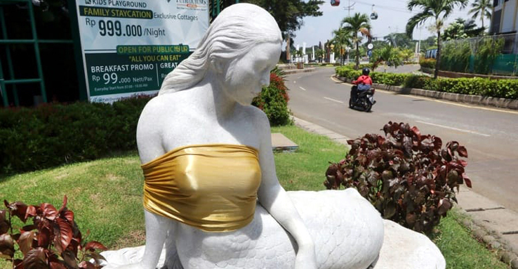 বিবিসির প্রতিবেদন থেকে জানা যায়, ইন্দোনেশিয়ার রাজধানী জাকার্তায় অবস্থিত ওই থিম পার্কের নাম আঙ্কল ড্রিমল্যান্ড। গত ১৫ বছর ধরে সেখানে আছে ভাস্কর্য দুটি। সম্প্রতি পার্ক কর্তৃপক্ষ সোনালি রঙা কাপড় দিয়ে রুপকথায় বর্ণিত মৎসনারীর আদলে তৈরি ভাস্কর্য দুটির খোলা বুক ঢেকে দেয়।