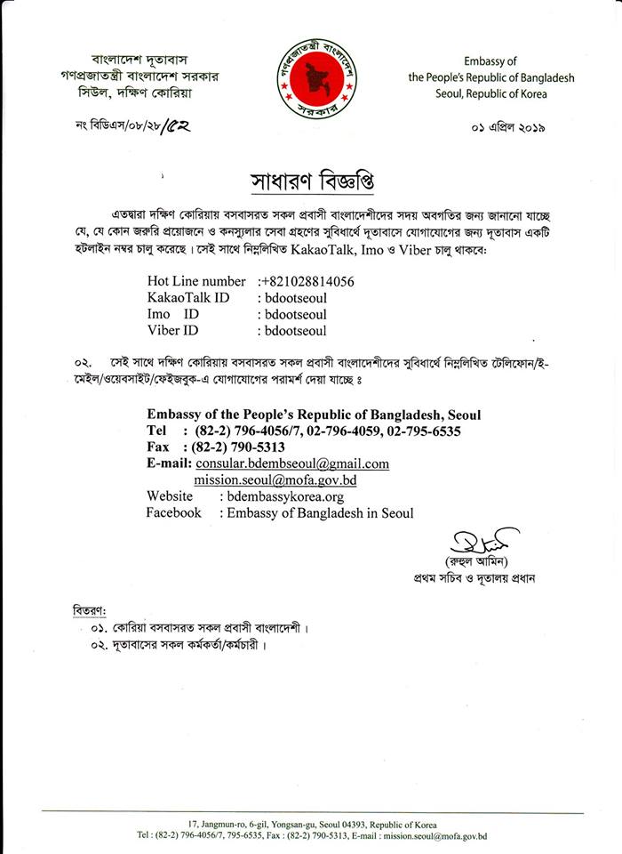 ই-মেইল- consular.bdembseoul@gmail.com, (mission.seoul@mofa.gov.bd