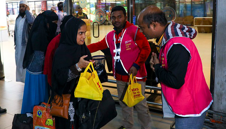 হযরত শাহজালাল আন্তর্জাতিক বিমানবন্দরে মধ্যপ্রাচ্য থেকে নির্যাতনের শিকার হয়ে দেশে ফেরা নারী কর্মীদের খোঁজ খবর নিচ্ছেন আল আমিন নয়ন।