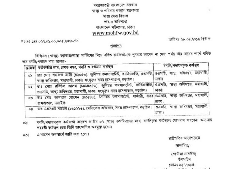 ওএসডি করা চিকিৎসকরা হচ্ছেন, সার্জারি চিকিৎসক আকরাম হোসেন, মেডিকেল অফিসার এ এস এম ছায়েম, কার্ডিওলজি বিশেষজ্ঞ শওকত আলী ও কাজী রবিউল আলম। গতকাল রোববার দুপুরে নড়াইল সদর হাসপাতালের তত্ত্বাবধায়কের দপ্তরে এ আদেশ এসে পৌঁছায়। তবে বিষয়টি জানাজানি হয় রাত সাড়ে ১১টার দিকে।