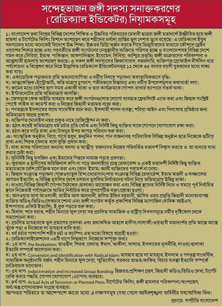 এ সকল জঙ্গি সদস্যদের জিজ্ঞাসাবাদ, নজরদারি, ব্যক্তিগত প্রোফাইল দীর্ঘদিন ধরে পর্যালোচনা ও বিশ্লেষণ করে রেডিক্যাল ইন্ডিকেটরসমূহ ১২ থেকে ৩৫ বছর বয়সী যুবকদের মধ্যে লক্ষ্য করা যায়। বিজ্ঞাপনটিতে সন্দেহভাজন জঙ্গি চেনার যে বৈশিষ্ট্যগুলো দেয়া হয়েছে তার কয়েকটির মধ্যে রয়েছে- একাডেমিক পড়াশুনার প্রতি অমনযোগিতা ও ধর্মীয় বিষয়ে পড়াশুনা অস্বাভাবিকভাবে বৃদ্ধি, আত্মকেন্দ্রিক (ইন্ট্রোভার্ট), অতিমাত্রায় চুপচাপ, গভীরভাবে চিন্তামগ্ন এবং ধর্মীয় উপদেশমূলক কথাবার্তা বলা, রুমের মধ্যে বেশিরভাগ সময় একাকী থাকা ও তার কার্যক্রমকে গোপন রাখার ব্যাপারে সতর্ক থাকা, ইন্টারনেটের প্রতি অতিমাত্রায় আসক্তি, গণতন্ত্রকে ইসলামের সাথে সাংঘর্ষিক মনে করা। ইসলামী শাসনব্যবস্থা, শরীয়া আইন এবং খিলাফাহ প্রতিষ্ঠার জন্য অতিমাত্রায় আগ্রহ প্রকাশ করা, ব্যক্তিগত মোবাইল নম্বর প্রকৃত নামে রেজিস্ট্রেশন না করা, সাংস্কৃতিক অনুষ্ঠান, বিয়ে, গায়ে হলুদ, জন্মদিন পালন, গান বাজনাসহ পারিবারিক বিভিন্ন অনুষ্ঠান হতে নিজেকে গুটিয়ে রাখা এবং শিরক/বিদাত বলে যুক্তি প্রদান করা, হঠাৎ করেই অতিমাত্রায় ধর্মচর্চার প্রতি ঝোঁক, হঠাৎ করে দাড়ি রাখা ও টাখনুর উপর কাপড় পরিধান শুরু করা, মিলাদ, শবে বরাত, শহীদ মিনারে ফুল দেয়াসহ প্রচলিত সামাজিক ও রাষ্ট্রীয় দিবসসমূহে ধর্মীয় দৃষ্টিকোণ থেকে সমালোচনা করা, ধর্মচর্চার পাশাপাশি শরীরচর্চা ও ক্যাম্পিংয়ের মতো বিষয়ে আগ্রহী হওয়া।