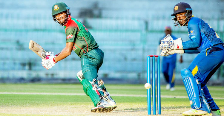 জবাব দিতে নেমে ২৭ রানের মধ্যে ২ উইকেট হারিয়ে বসে শ্রীলঙ্কা ‘এ’ দল। কামিন্ডু মেন্ডিস ৫৫ আর প্রিয়ঞ্জন ৩৪ রান করলেও দ্রুত আরও কয়েকটি উইকেট হারিয়ে বিপদে পড়ে স্বাগতিকরা। ১২৯ রানের মধ্যে তাদের ৬ উইকেট তুলে নেন বাংলাদেশি বোলাররা। এর সঙ্গে আর ১ রান যোগ হতেই আলোকস্বল্পতায় খেলা বন্ধ হয়ে যায়।