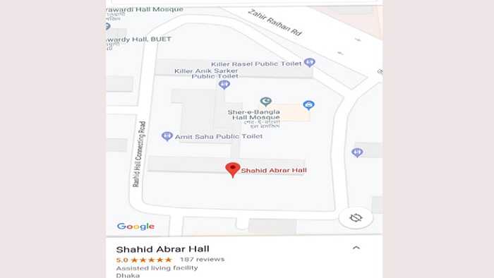 বাংলাদেশ প্রকৌশল বিশ্ববিদ্যালয়ের (বুয়েট) শেরেবাংলা হলের নাম এখন ‘শহীদ আবরার হল’। আর হলের ভেতরে থাকা চারটি টয়লেট বা শৌচাগারের নামকরণ করা হয়েছে নির্মম অত্যাচারের শিকার হয়ে মৃত্যুবরণ করা আবরার ফাহাদের খুনিদের নামে। গুগলের মানচিত্রে সার্চ দিলে এখন এমনটাই দেখা যাচ্ছে। যদিও বুয়েট প্রশাসন কিংবা সরকারিভাবে এরকম কোনো উদ্যোগ নেয়ার খবর এখন পর্যন্ত পাওয়া যায়নি।