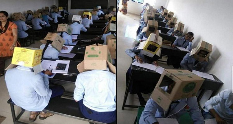 মাথায় বাক্স পরে ছাত্রছাত্রীদের পরীক্ষা দেয়ার ছবি ভাইরাল হয়েছে সোশ্যাল মিডিয়ায়। ওই কলেজের ছাত্রছাত্রীদের মধ্য নকলের প্রবণতা নিয়ে চিন্তিত ছিল কলেজ কর্তৃপক্ষ। অনেক বার চেষ্টা করেও তারা নকল ঠেকাতে পারছিলেন না। তাই বাধ্য হয়েই এমন অভিনব পদ্ধতি বেছে নিয়েছে কলেজ কর্তৃপক্ষ।