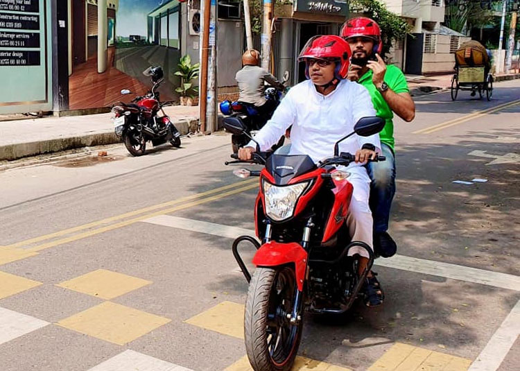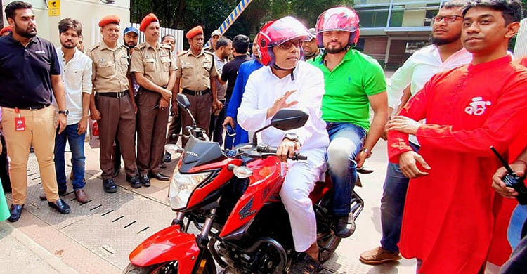 বাইক চালাচ্ছেন তথ্য ও যোগাযোগ প্রযুক্তি (আইসিটি) বিভাগের প্রতিমন্ত্রী জুনাইদ আহমেদ পলক। পেছনে পাঠাওয়ের ব্র্যান্ড অ্যাম্বাসেডর ও সংসদ সদস্য ক্রিকেটার মাশরাফি বিন মুর্তজা।