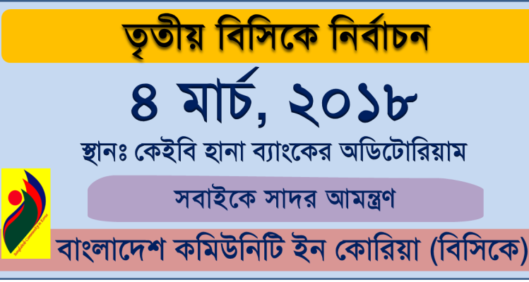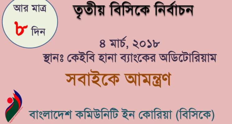 আগামী ৮ মার্চ দক্ষিণ কোরিয়ার সিউলে বাংলাদেশ কমিউনিটি ইন কোরিয়া’র নির্বাচন অনুষ্ঠিত হতে যাচ্ছে। সিউলের কেইবি হানা ব্যাংকের হেড অফিসের মিলনায়তনে এই নির্বাচন অনুষ্ঠিত হতে যাচ্ছে। দক্ষিণ কোরিয়া প্রবাসীদের অরাজনৈতিক সংগঠন বিসিকে বিভিন্ন পেশা এবং […]