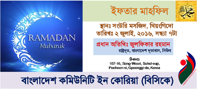 আগামীকাল দক্ষিণ কোরিয়ার পাজু মসজিদে ইফতার মাহফিলের আয়োজন করা হয়েছে। বাংলাদেশী অধ্যুষিত এলাকা পাজুতে বাংলাদেশীদের পরিচালিত এই মসজিদে প্রতিবছর এই ইফতার মাহফিলের আয়োজন করা হয়। ইফতার মাহফিলে প্রধান অতিথি হিসেবে উপস্থিত থাকবেন সিউলস্থ বাংলাদেশ দূতাবাসের […]