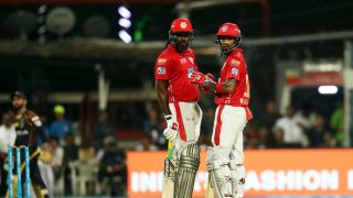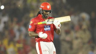 প্রথম দুই ম্যাচ বেঞ্চে বসে কাটানো গেইল টানা তৃতীয় ম্যাচের মতো প্রমাণ করলেন এখনো ফুরিয়ে যাননি তিনি। বৃষ্টি নামার আগে মাত্র ২৭ বলে ৪৯ রান করে অপরাজিত থাকেন গেইল। ৫টি চারের পাশাপাশি ৪টি গেইলীয় ছক্কা মারেন তিনি। উদ্বোধনী জুটিতে তার সঙ্গী লোকেশ রাহুল ৭ চার এবং ১ ছক্কার মারে ২৩ বল খেলে ৪৬ রান করে অপরাজিত আছেন।